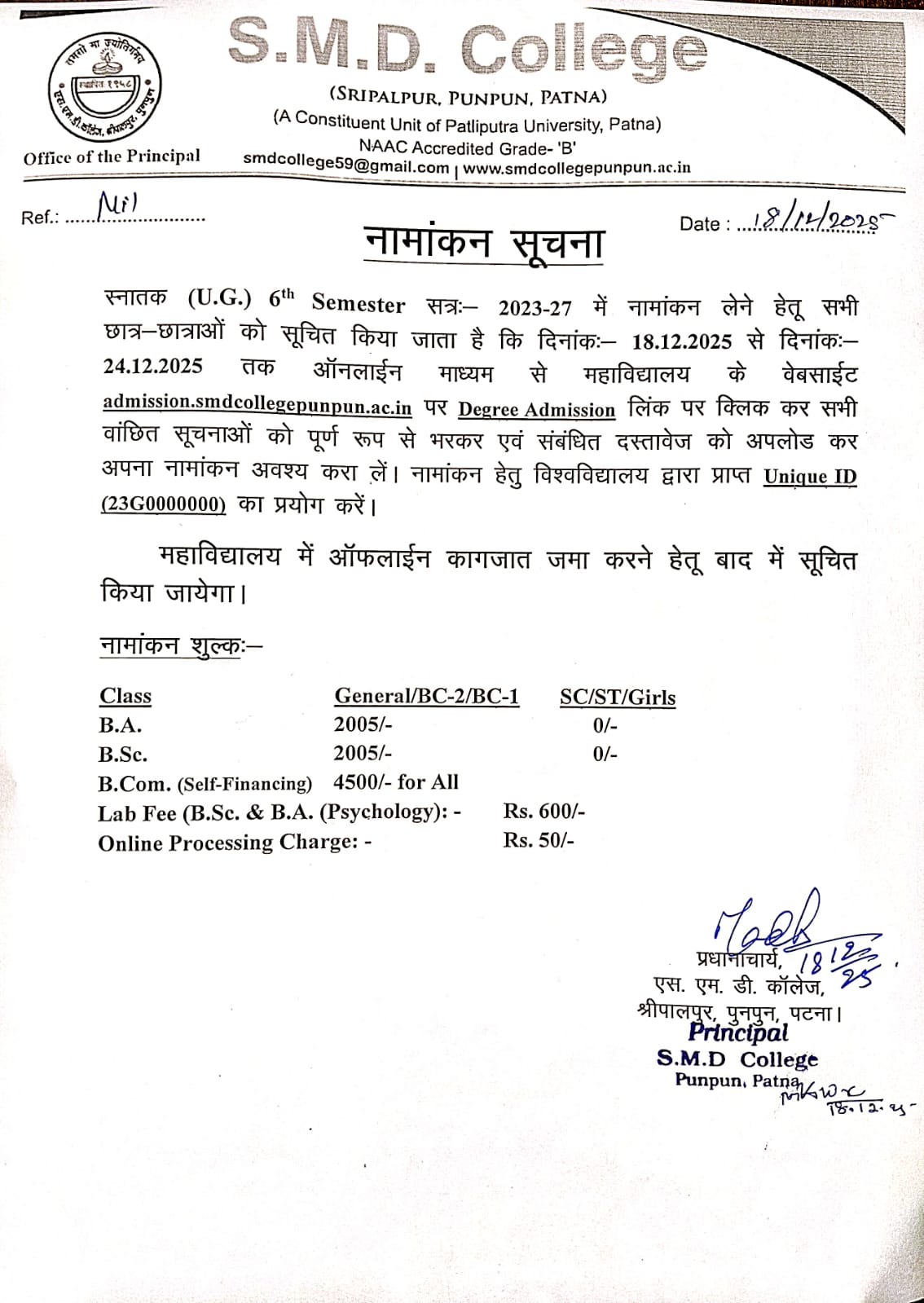 NOTICE REGARDING UG 6TH SEMESTER ADMISSION (2023-27)