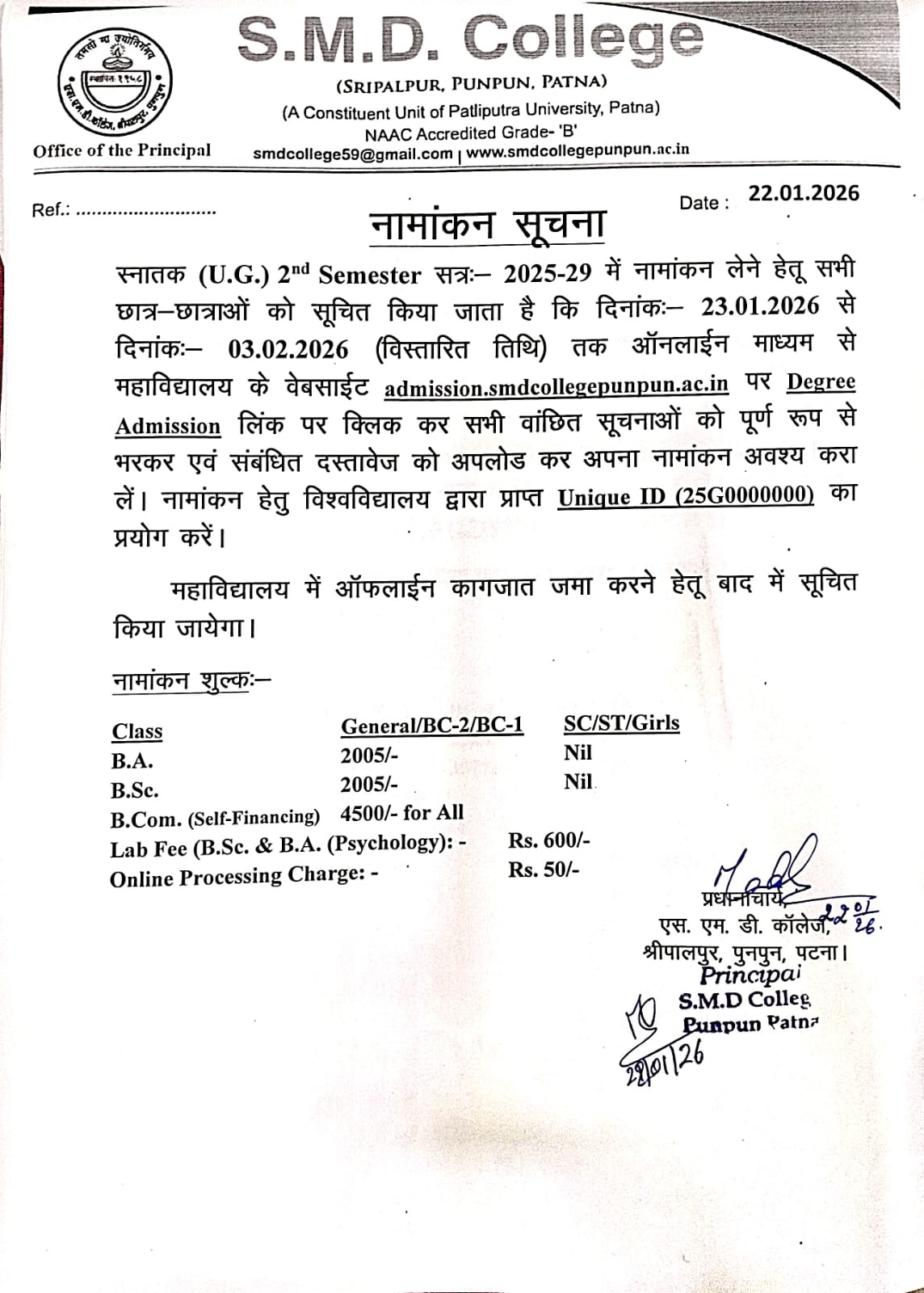 NOTICE REGARDING UG 2ND SEMESTER (2025-29) ADMISSION DATE EXTENDED OF 03-02-2026