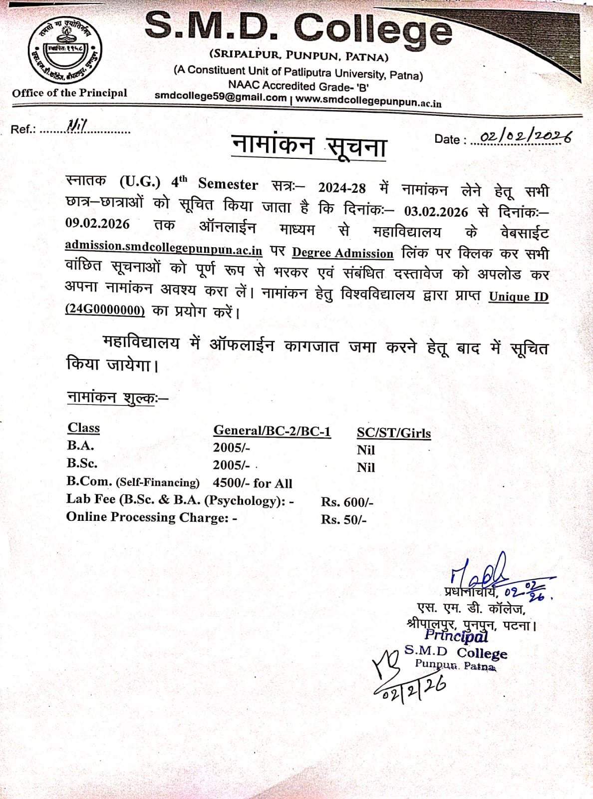 News & Updates >> NOTICE REGARDING UG FOR 4TH SEMESTER ADMISSION (2024-28)