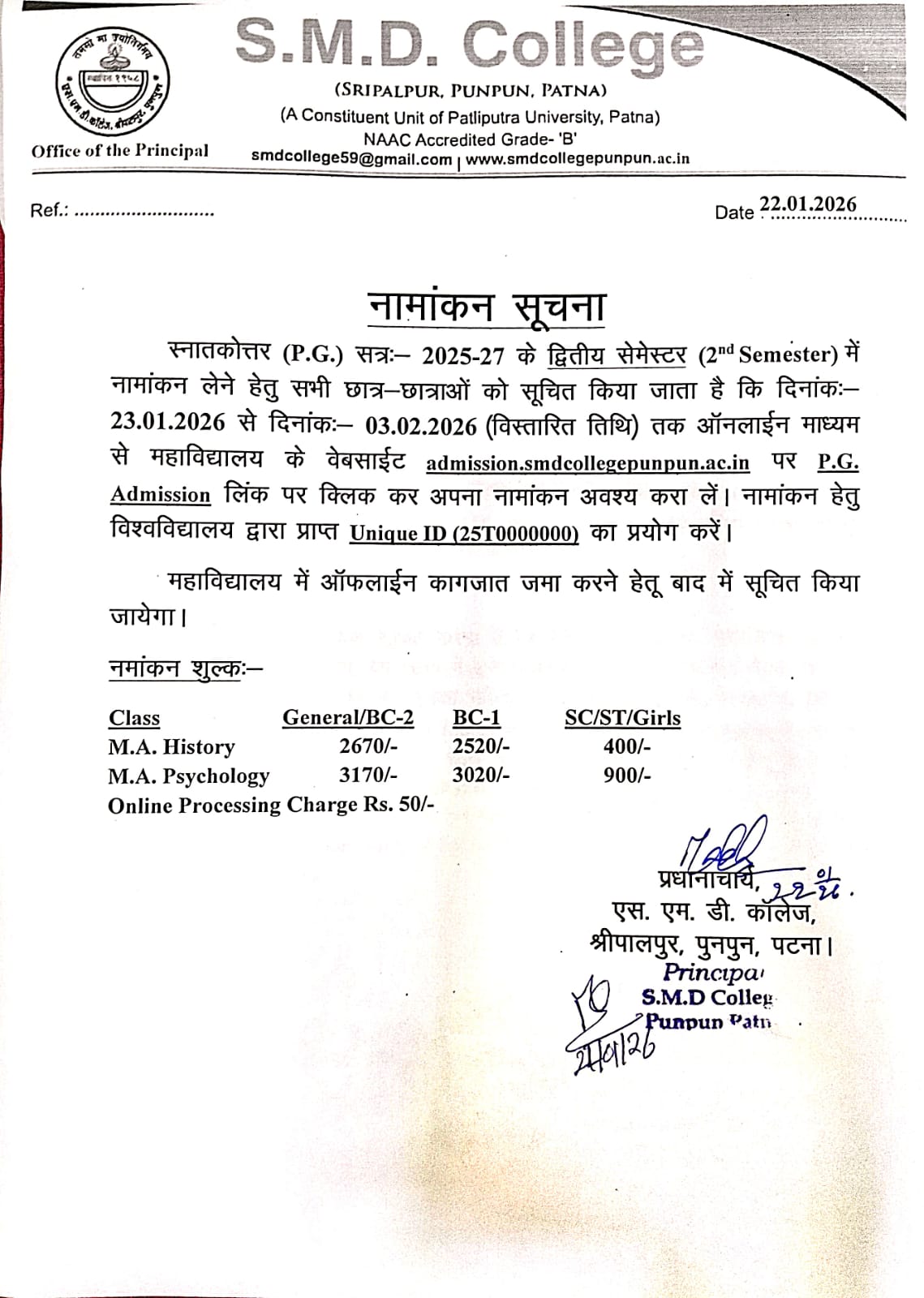 News & Updates >> NOTICE REGARDING PG 2ND SEMESTER (2025-27) ADMISSION DATE EXTENDED OF 03-02-2026